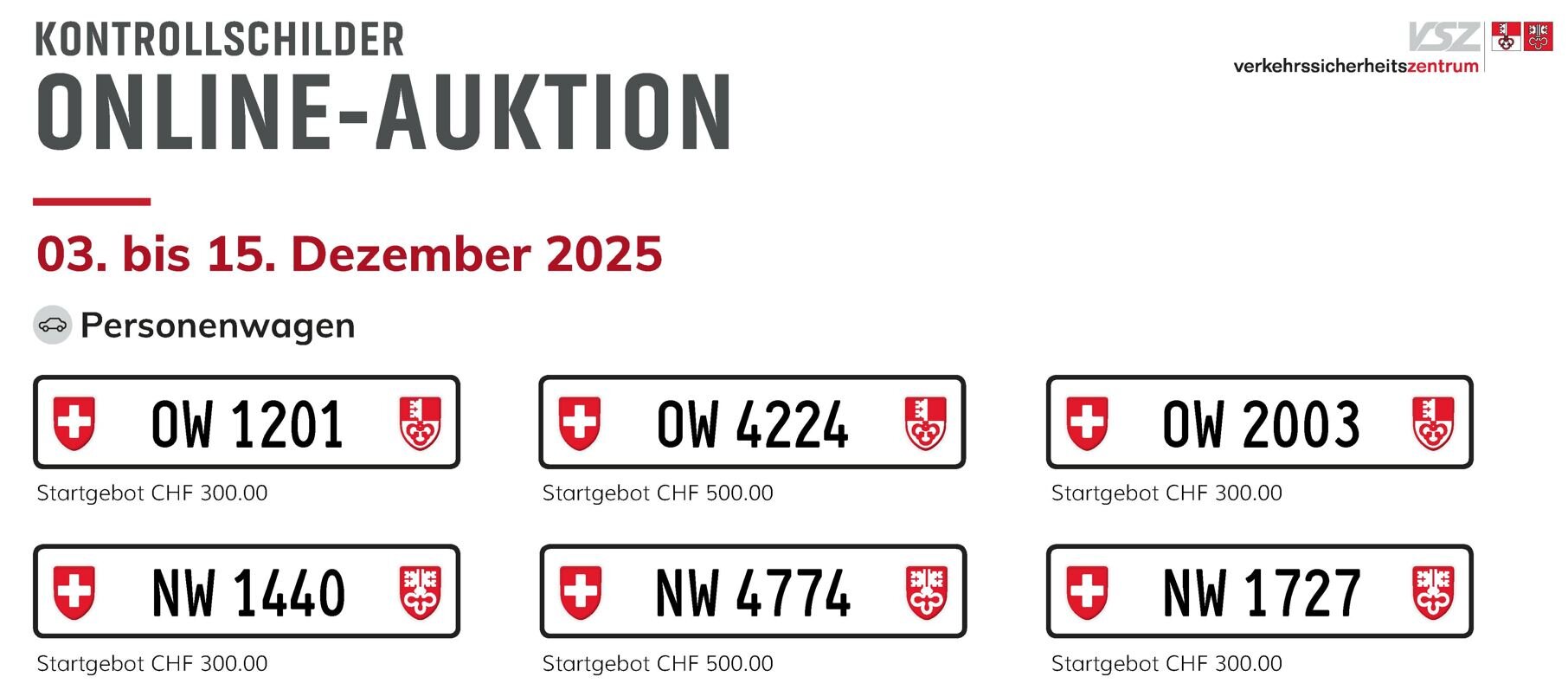 Die nächste Kontrollschilder-Auktion findet vom Mittwoch, 3. Dezember 2025 bis Montag, 15. Dezember 2025 statt.